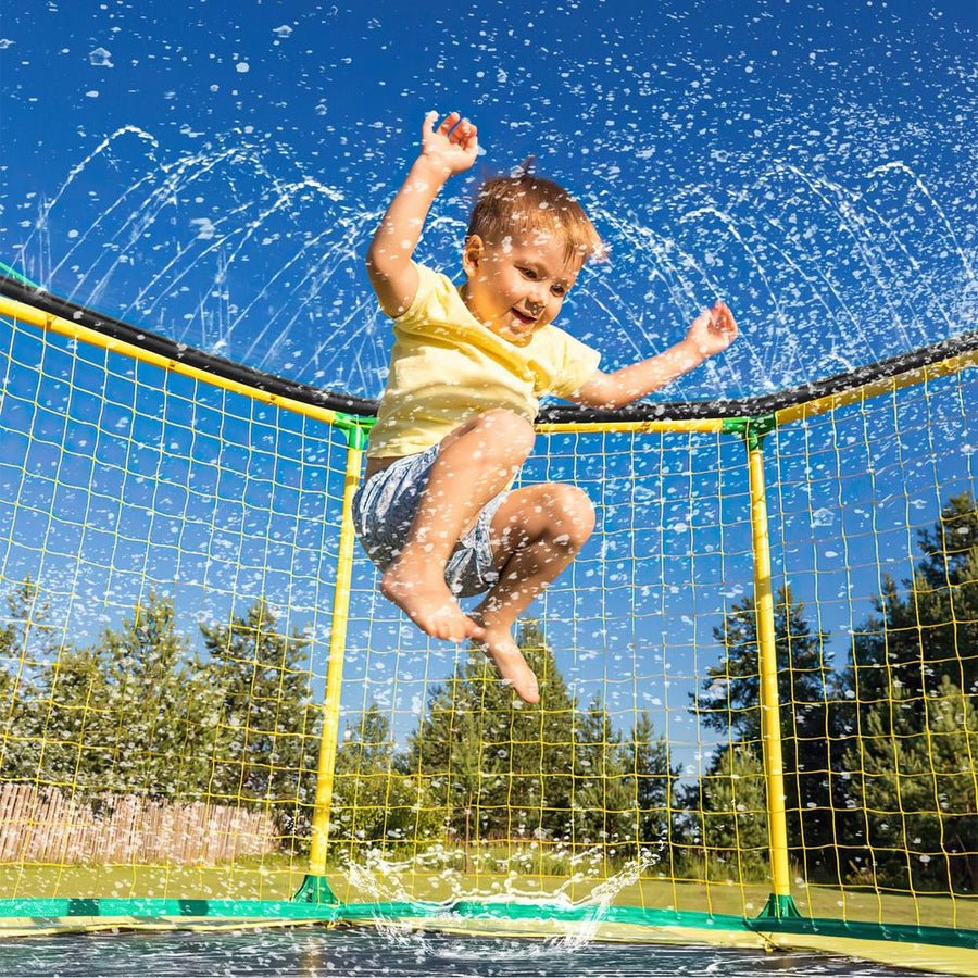 Make a splash this summer with this exciting inflatable pool featuring a fun slide, water sprayer arch, toss rings, targets and more!